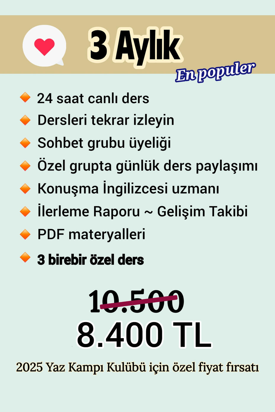 Çünkü 3 ayda, gelişiminizi daha net takip edebiliyoruz. Her öğrencinin öğrenme hızı farklıdır, ancak biz kayıt olduğunuz ilk günden itibaren sizinle birlikteyiz.Şirketlere yönelik İngilizce eğitimi veriyor musunuz?
